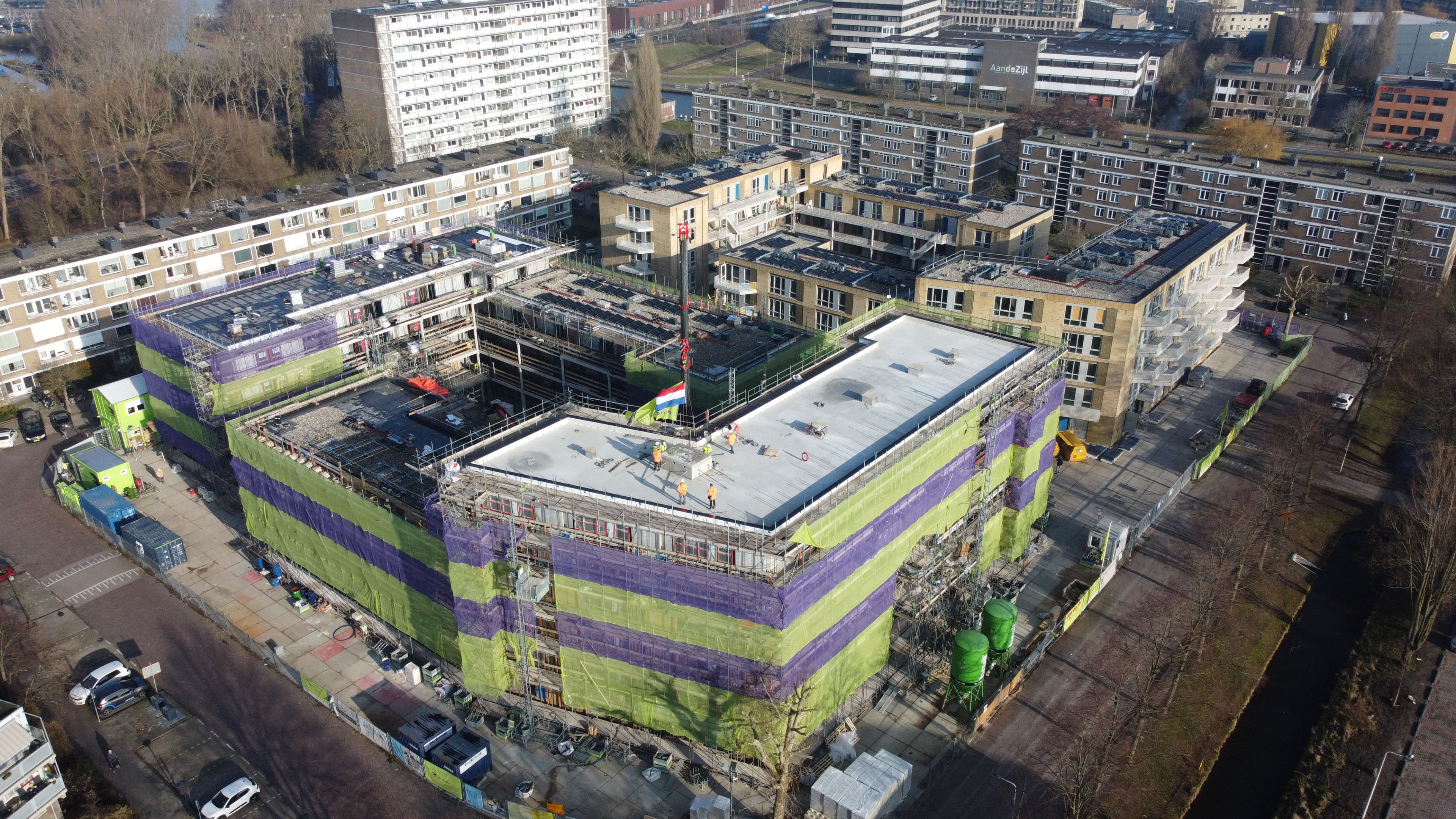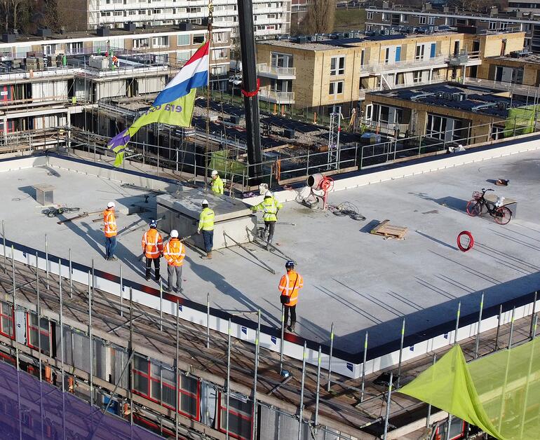 Op dinsdag 20 januari werd het laatste betonnen element op het dak van het vierde gebouw gelegd en daarmee zijn alle gebouwen nu op hoogte. De vrijdag daarop werd dit traditioneel gevierd met de bouwmedewerkers, met een snackcar tijdens de lunch.