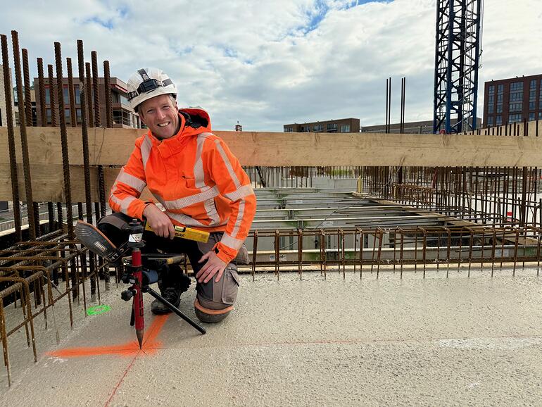 “Als ze door kunnen! Soms ben ik de vertragende factor, hoor. Als het mistig is, kan ik niet meten. Of als het hard waait of de vloer vol water staat. Dan moet je creatief zijn. Als de vloer door veel regen een zwembad is, zet ik bijvoorbeeld pijpjes uit in plaats van schrappies, zodat de jongens toch hun meetpunten hebben. Op de bouw moet je improviseren.”