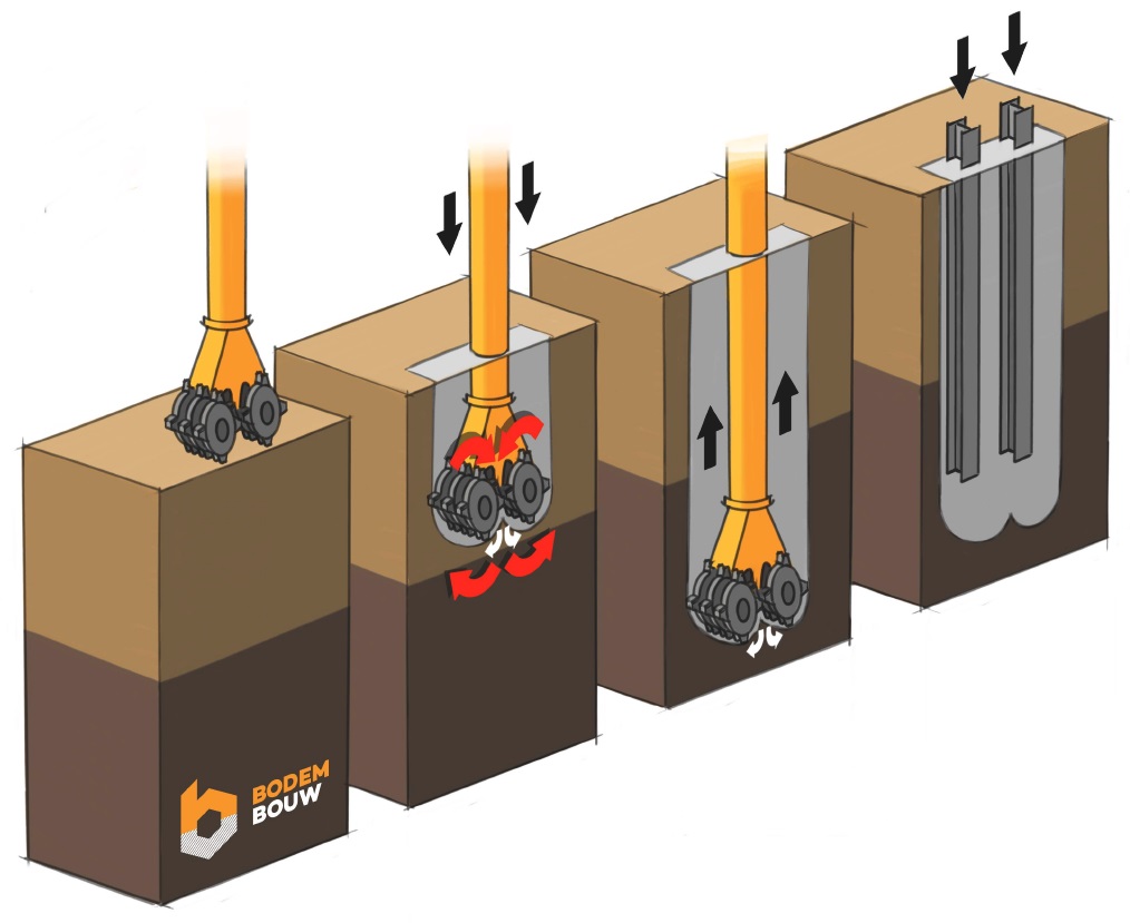 De eerste paal zit in de grond! Dit betekent dat we nu echt gestart zijn met de bouw van de torens aan de Lomanlaan. De komende maanden boren we eerst alle palen voor de fundering, zodat we na de zomervakantie aan de slag kunnen met de buitenste wanden van de kelder. Dit zijn zogenaamde CSM wanden. Bij dit systeem wordt de grond gemengd met cement waardoor er uiteindelijk een aaneengesloten betonnen wand ontstaat. Hieronder ziet u hoe we dit doen. Zowel bij het boren van de palen als het maken van de CSM wanden is er weinig geluidsoverlast en ontstaan er geen trillingen.